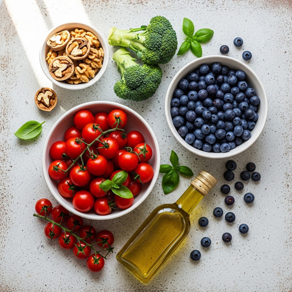 식물은 뜨거운 햇볕과 해충으로부터 자신을 보호하기 위해 특별한 물질을 만들어내는데, 그것이 바로 '파이토케미컬'입니다. 이것이 우리 몸에 들어오면 강력한 항산화제 역할을 하죠. 저는 장을 볼 때 무지개색을 담으려고 노력합니다. 토마토의 빨간색(라이코펜)은 혈관 노화를 막아주고, 브로콜리의 초록색(설포라판)은 해독 작용을 돕습니다. 특히 보라색을 띠는 블루베리나 가지의 안토시아닌은 눈 건강과 뇌세포 보호에 탁월합니다. 단순히 배를 채우는 식사가 아니라, 내 세포를 지키는 '색깔 방패'를 입힌다는 마음으로 식단을 구성해 보세요.